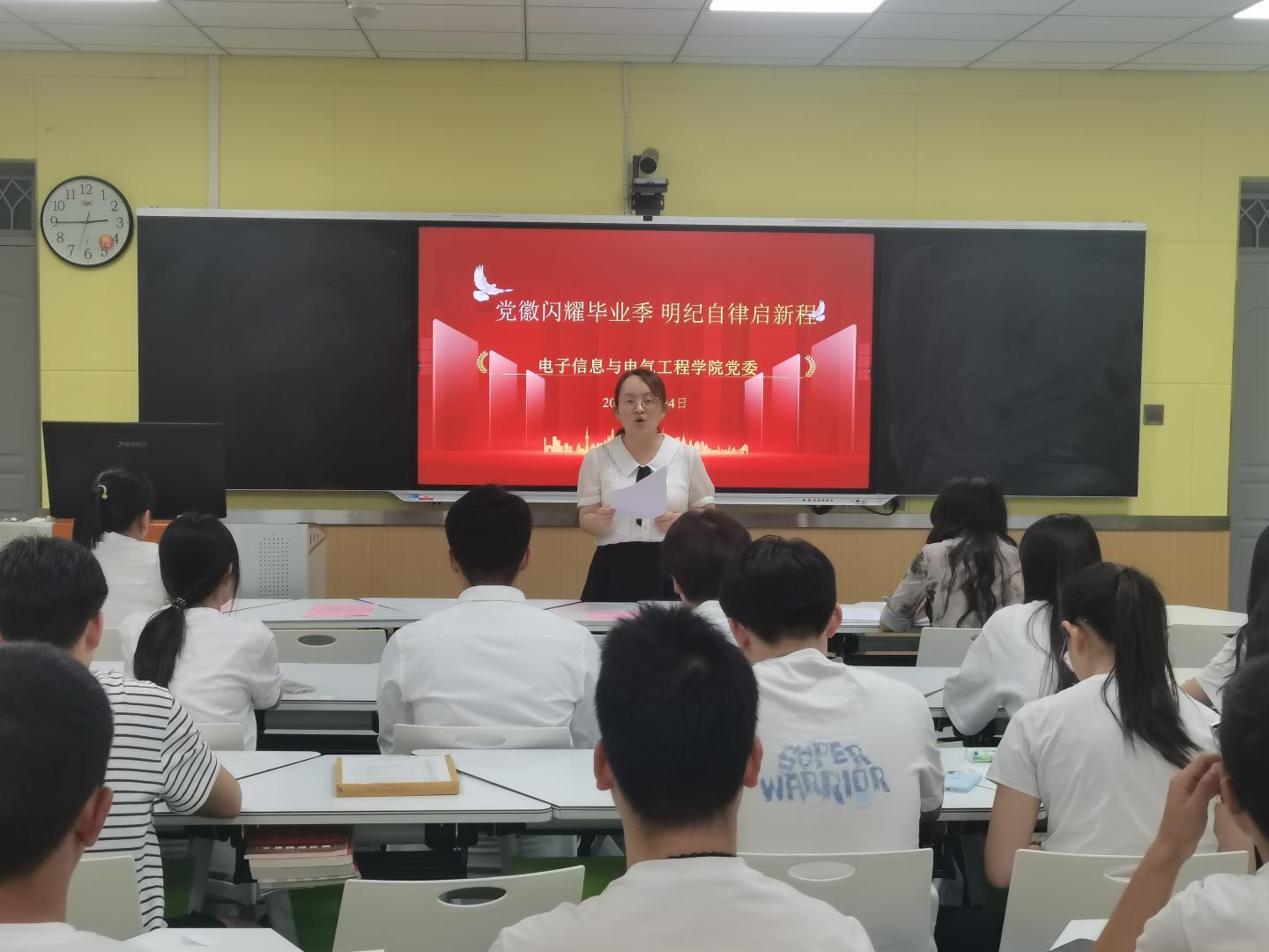 聆听一堂纪律党课,筑牢思想防线。赵永平结合党纪学习教育,为全体毕业生党员作主题为《学纪守纪 永葆共产党员本色》的纪律党课。他围绕新版《中国共产党纪律处分条例》,重点讲述了《条例》修订背景、主要内容和新增亮点,要求毕业生党员时刻在思想上筑牢防线,防微杜渐,警钟长鸣,注意从小事做起,“勿以善小而不为,勿以恶小而为之”,做到堂堂正正做人,清清白白做事;在行动上,要遵守纪律,严格管理,以自己的实际行动赢得身边群众的口碑、信任和拥护。