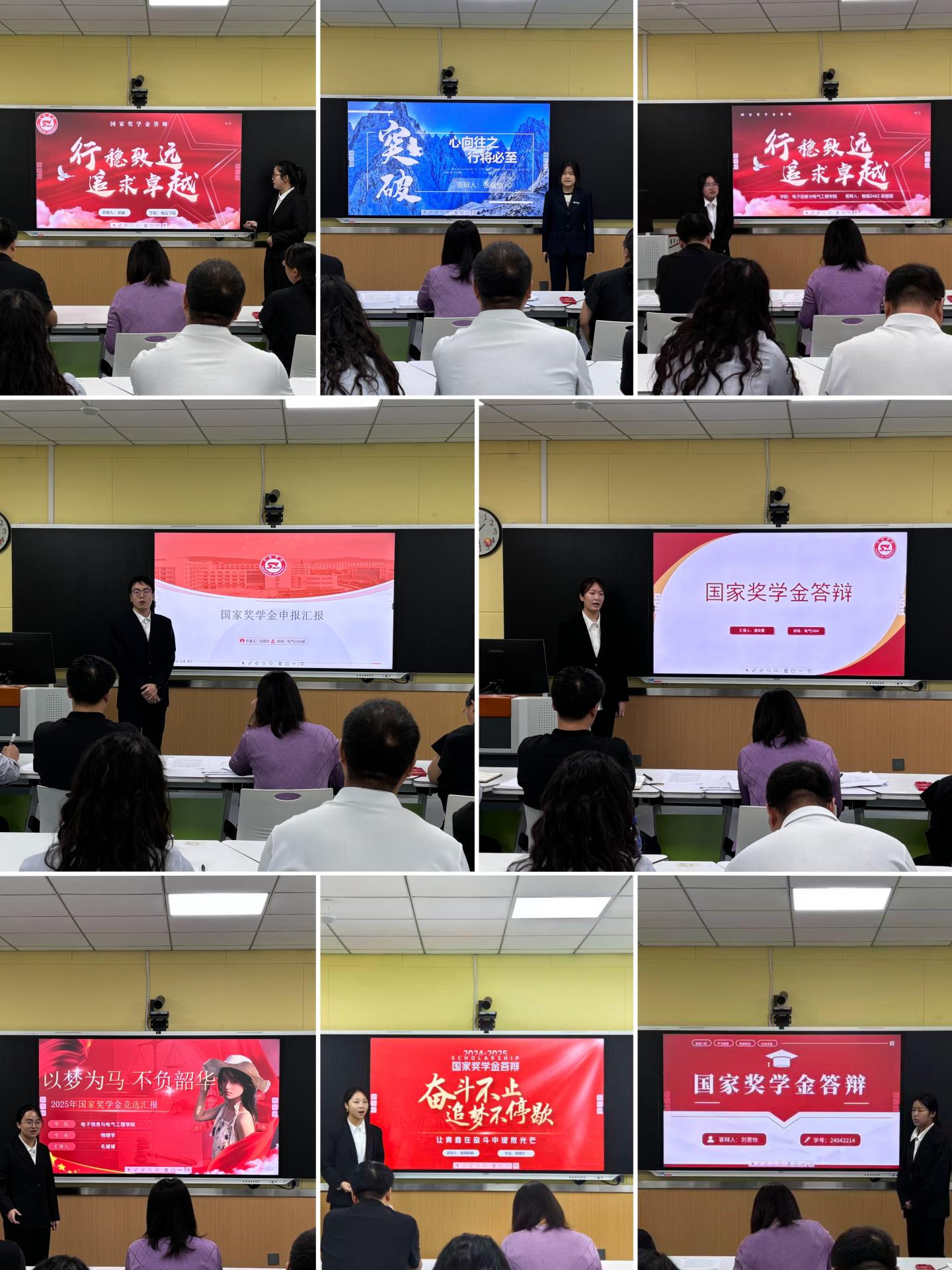 经个人申请、班级推荐、年级民主评议等多轮筛选,8名优秀候选人脱颖而出,进入最终答辩环节。答辩会上,同学们围绕思想表现、学业成绩、科研创新、员工工作、社会实践、志愿服务和文体活动等多个维度,通过PPT进行全面展示,充分体现了电信学子脚踏实地、锐意进取的精神风貌与综合素养。评审小组坚持公平、公正、公开原则,依据申报材料和现场表现进行综合评定,最终形成推荐名单,并报批公司国家奖学金评审工作组审核。