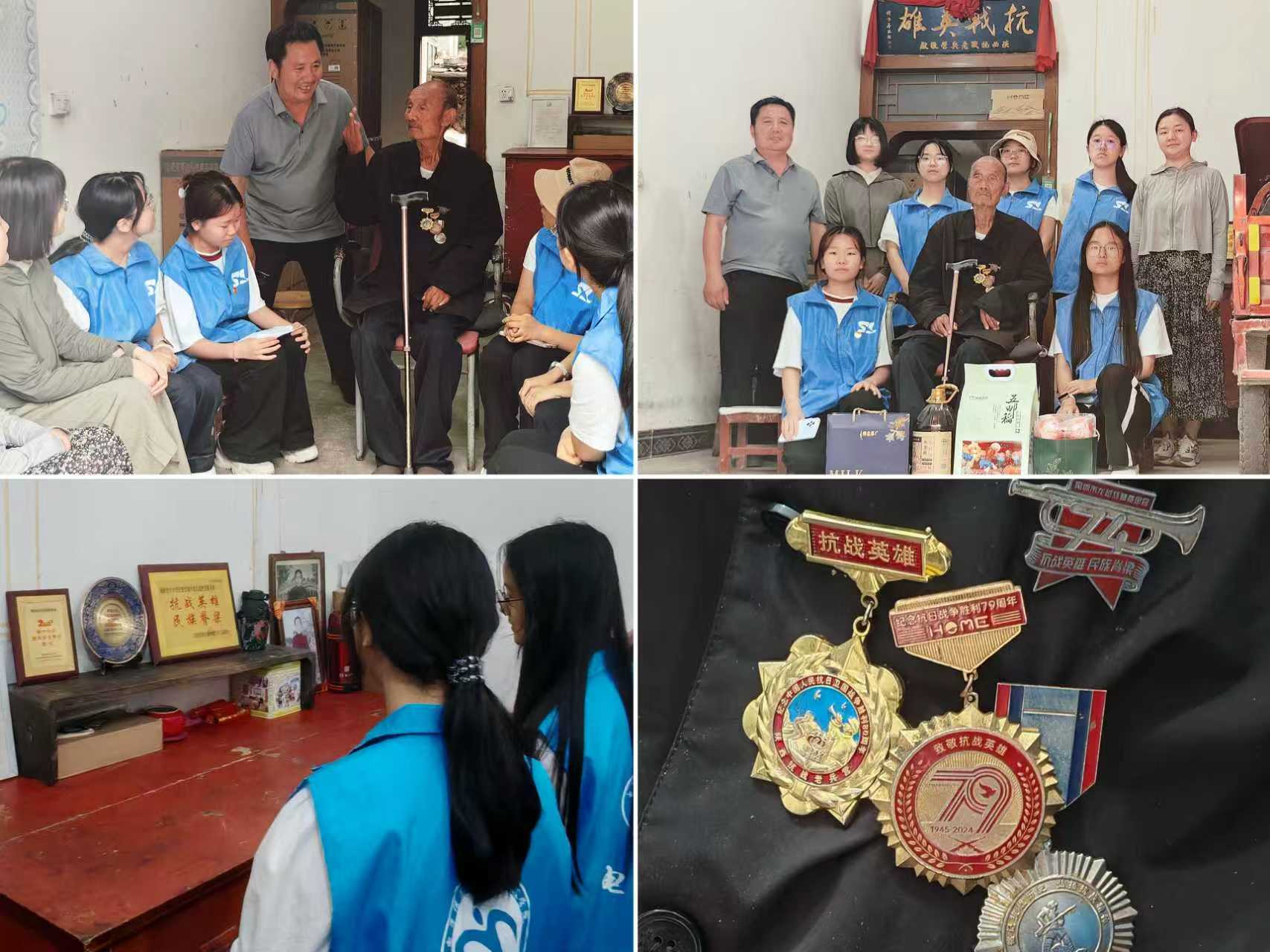 令人感慨的是,岁月的流逝本已让老人的身体渐添风霜,而那场战争更在他身上留下了沉重的烙印——如今他既听不清周遭的声音,也难以开口言语,因此由他的儿子代为介绍情况。从访谈中得知,在当年艰苦的作战环境及物资条件下,周保印老人于1943年、1945年两次入伍,在抗日战争中作为后方炮手参加过多场重要战役。采访结束后,老人的家人向实践团成员介绍了老人抗战所获得的纪念勋章,并勉励同学们:“你们是国家的未来,要好好学习,把咱们的国家建设得更强大,别让历史重演!”